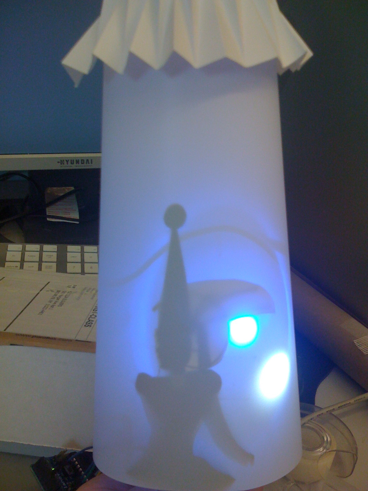 I have continue to experiment with the ability of paper, specifically velum, to diffuse light and create a sense of depth through the manipulation of shadow. A parallel process has been experimenting with the different shapes the piece could take. A while ago, I came across an amazing book, for any body who builds with paper, titled “Paper Forms”. This book has introduced me to a variety to techniques that allows you to create more structurally complex forms with paper. This prototype integrates one of this techniques and also an element of story telling. In this iteration we can see the appearance of one character. The character is also made out of paper and it is one of the 4 that will be present in the next iteration of this prototype. This characters ideally offer the user an open narrative and a sense of discovery as the light is turned on.