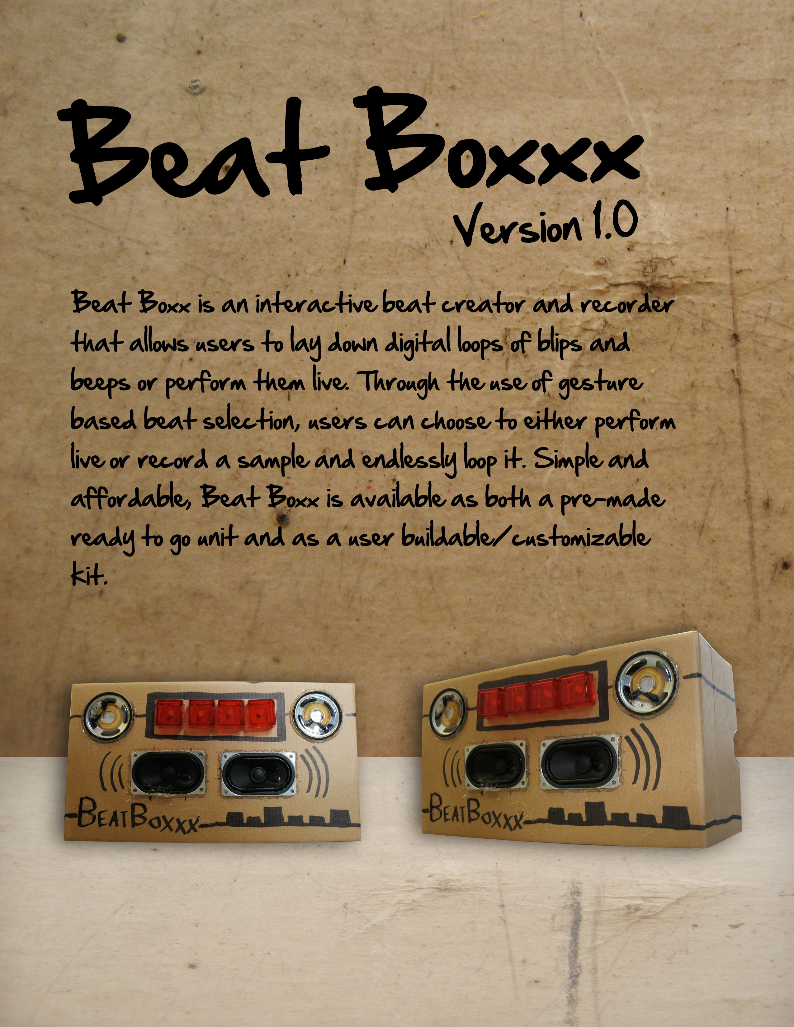 Beat Boxx is an interactive beat creator and recorder that allows users to lay down digital loops of blips and beeps or perform them live. Through the use of gesture based beat selection, users can choose to either perform live or record a sample and endlessly loop it. Simple and affordable, Beat Boxx is available as both a pre-made ready to go unit and as a user buildable/customizable kit.