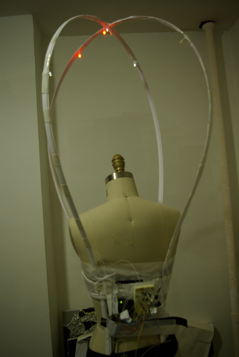 Then, when she or Zack triggers the conductive spots on her bustier, cold white or red Leds will turn on or off. Their fading will visualize the x and the y axis of the accelerometer placed on Michelle.