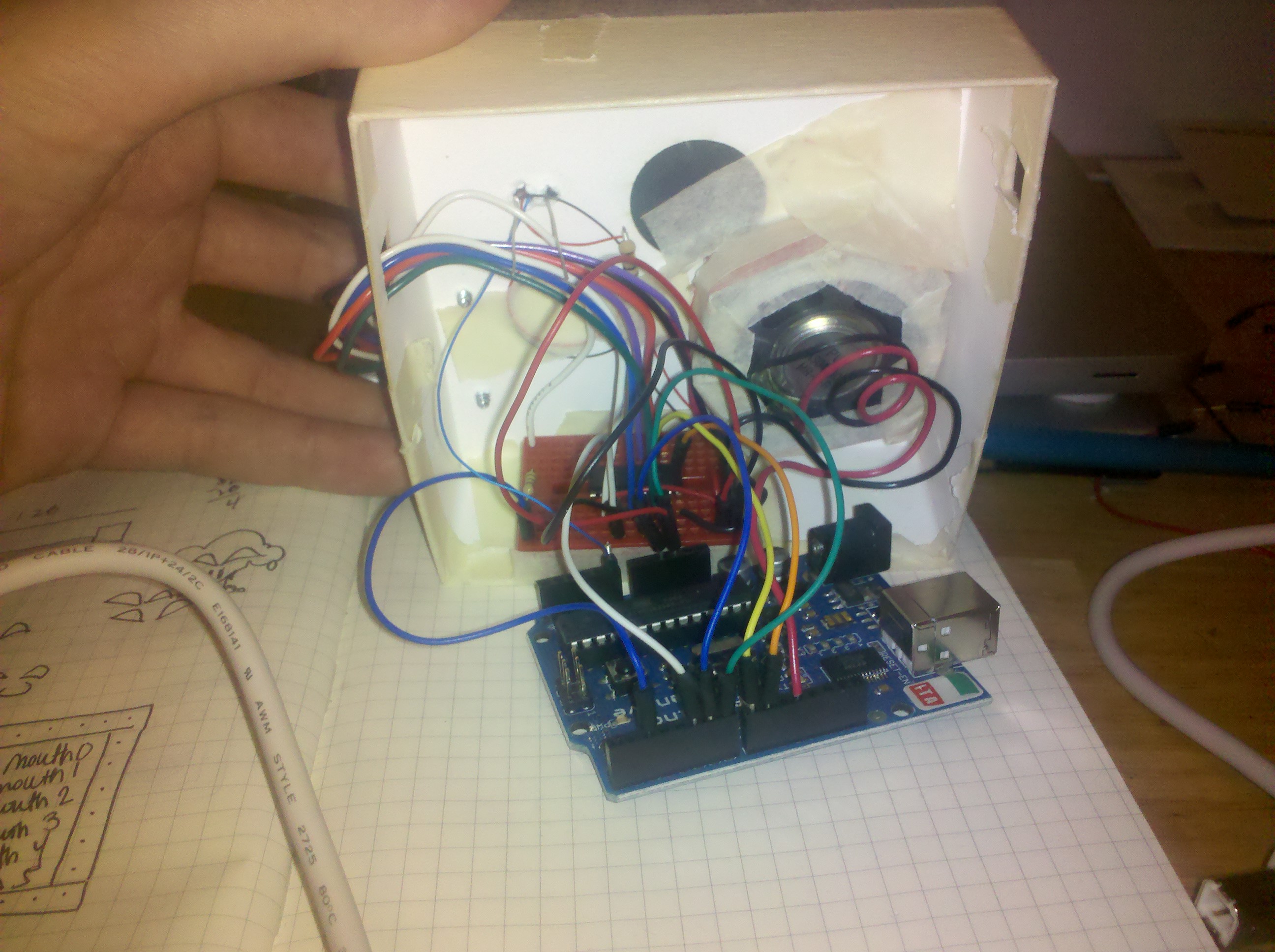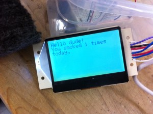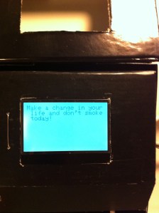 The idea was to make a cigarette box for a person who wants to quit smoking. It contains the cigars in it so it detects each time you open the box to get a cigarette. Ideally, it would output how many times the box is opened, when it’s last opened (how many minutes passed since), a sad character if you open it too often, a happy character if you open it seldom. And it would play different sounds for different steps. One sound for 5th time, another more harsh one for 10th, harsher for 15 and a dying sound for 20.