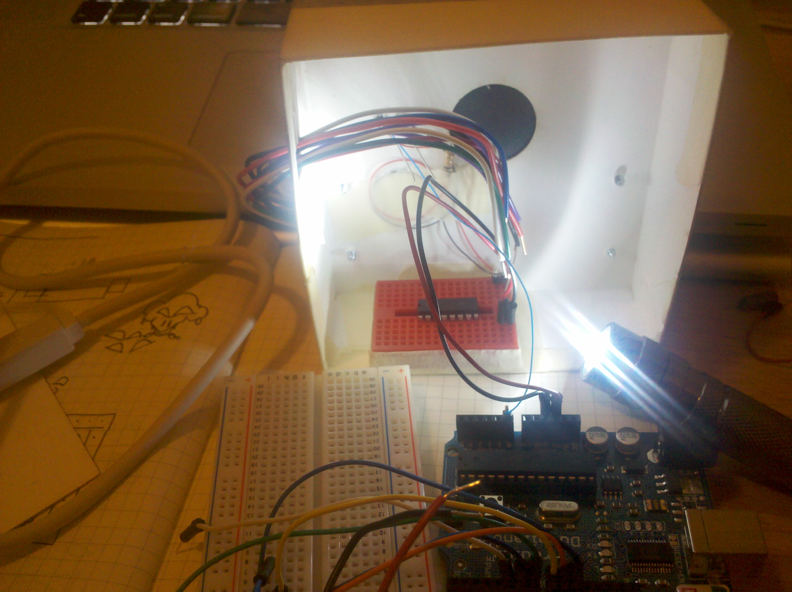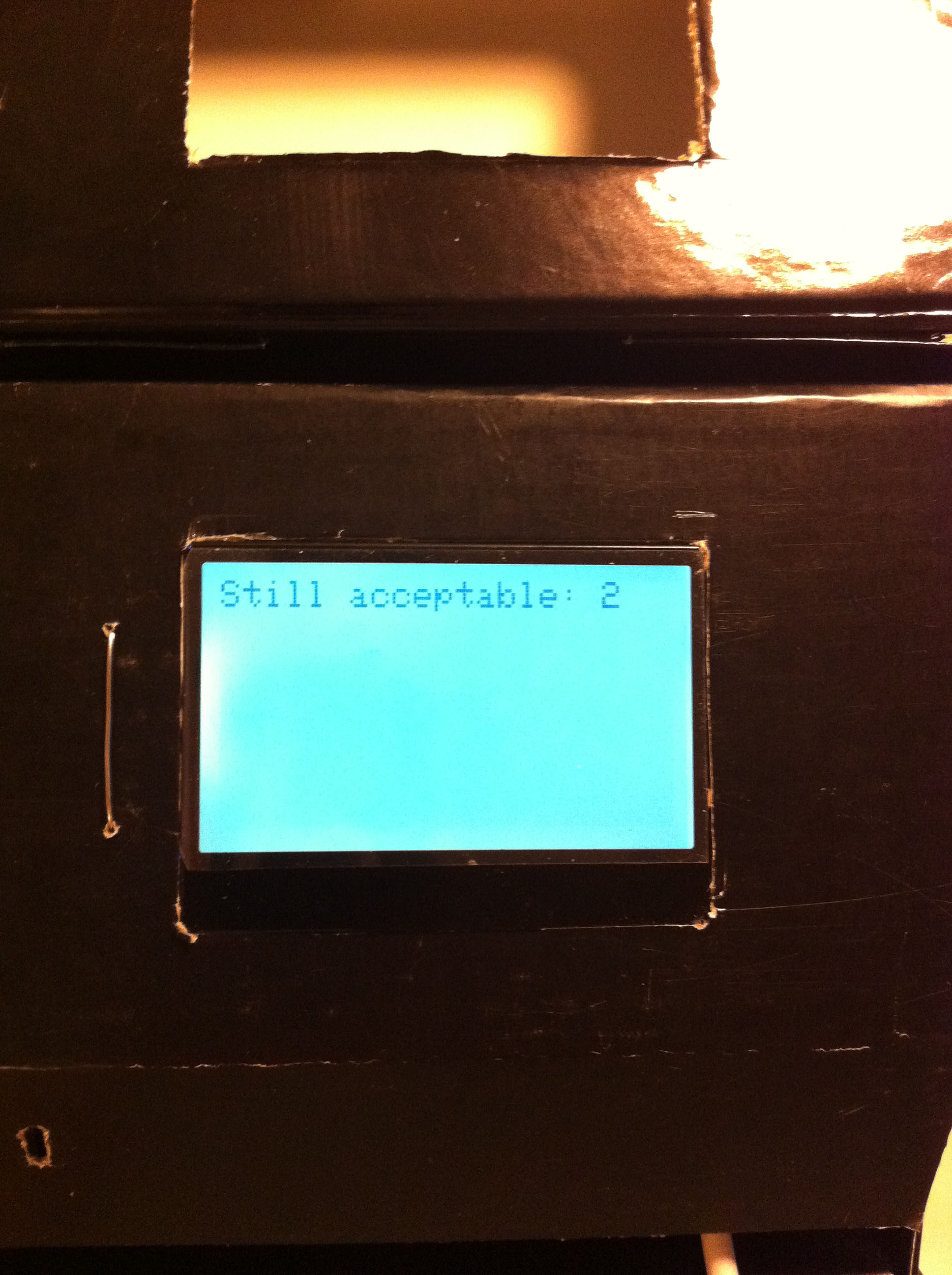Now how it works: There’s a light sensor inside that detects if the box is opened or not. The LCD screen outputs the number of times the box is opened with a touchy message. It beeps each time you open the box, it beeps like an alert when you hit 5, 10, 15 times. There’s a smiley face in the beginning that welcomes, it turns into a sad face whenever you open the box and it turns into aย laughย face when you do not open the box for a while. Right now, it’s 20 sec.