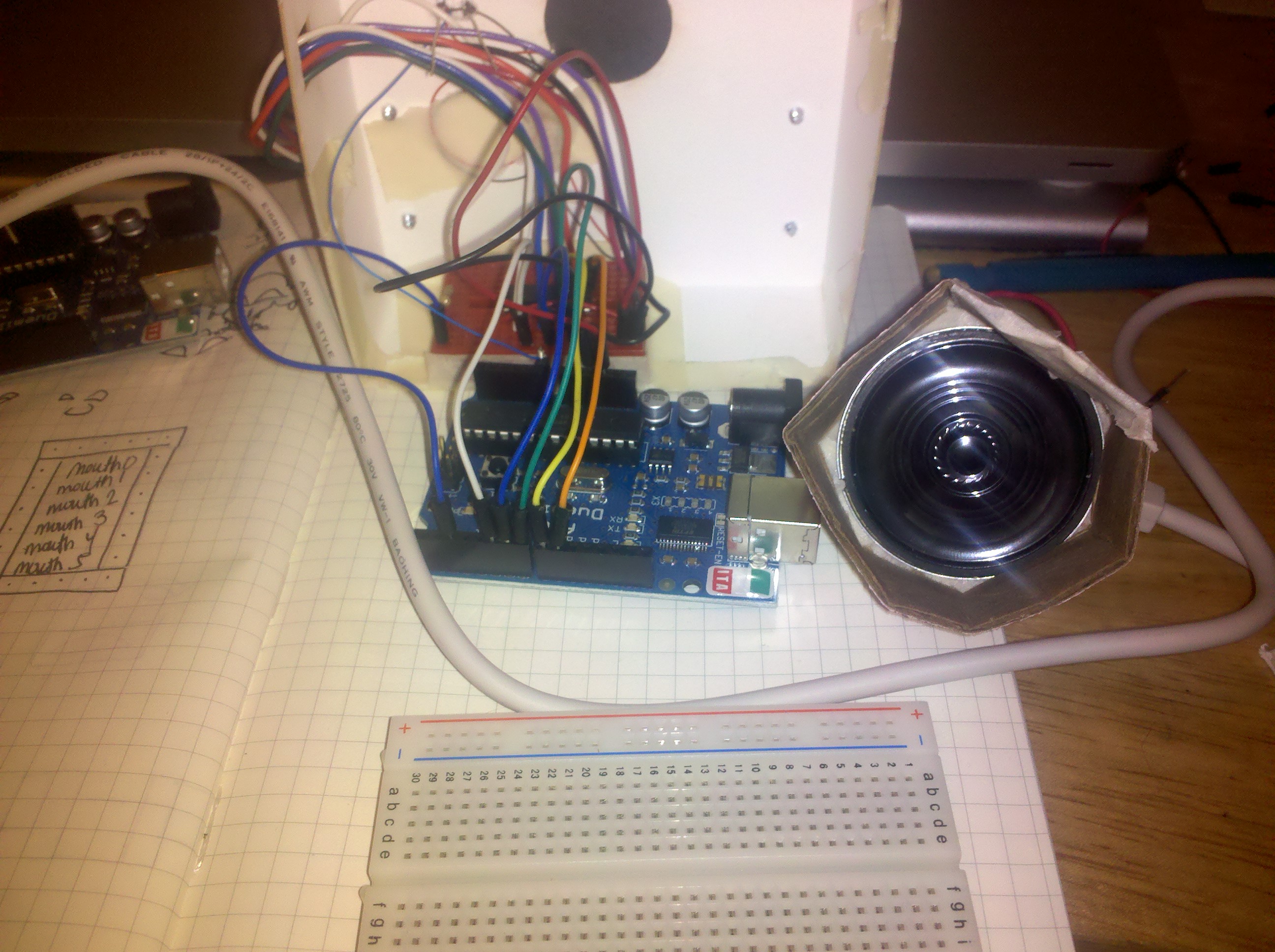 Fortunately, after a bit of looking around, I realized that my dog’s food is kept in a contraption like Lee’s trash can, and the idea of a talking dog food dispenser amused me greatly. Not only does it do the opposite of a trash bin (it provides instead of consumes), I also really liked that it could potentially talk to my dog, who seemed to be the most interested in the beeps and boops that my arduino can make. Lastly, using an upper-class British character as a model for my creatures words (I was thinking of Stephen Fry), seemed much funnier and silly and ironic on a dog food dispenser than on a recycling bin, which came across as haughty and judgmental.