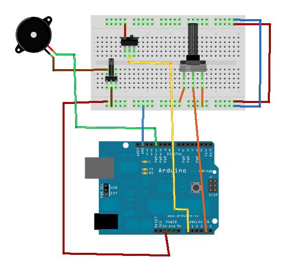First I threw together a simple device to let me test out the different sounds I could get out of my piezo. After some basic experimentation, I found the range of acceptable sounds (defined as them not hurting my ear) to be 50-1000 Hz. I mapped this to the range of a potentiometer (0-1024) and set it so that the piezo would play at the relevant frequency to the level of the potentiometer. While testing, I added two additional things: A potentiometer to control the volume of the piezo, and a switch that could silence the piezo without having to unplug it (I found myself uploading the code a lot, and got tired of the constant buzz resulting from keeping it plugged in.