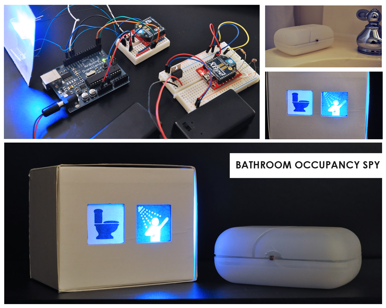My roommate is always frustrated with the rest of us making it into the bathroom before she does. Here is a remote bathroom occupancy system that can keep her in bed and happy. By utilizing the romantic light sensor workshop from last week, I was able to achieve the wireless communication between my two Xbees. The router is in a soup container placed inside of the bathroom and the coordinator is in a box by her bed side with two icon lights that allow her to know if the person has left, is only using for 5 min or for longer (taking a shower).