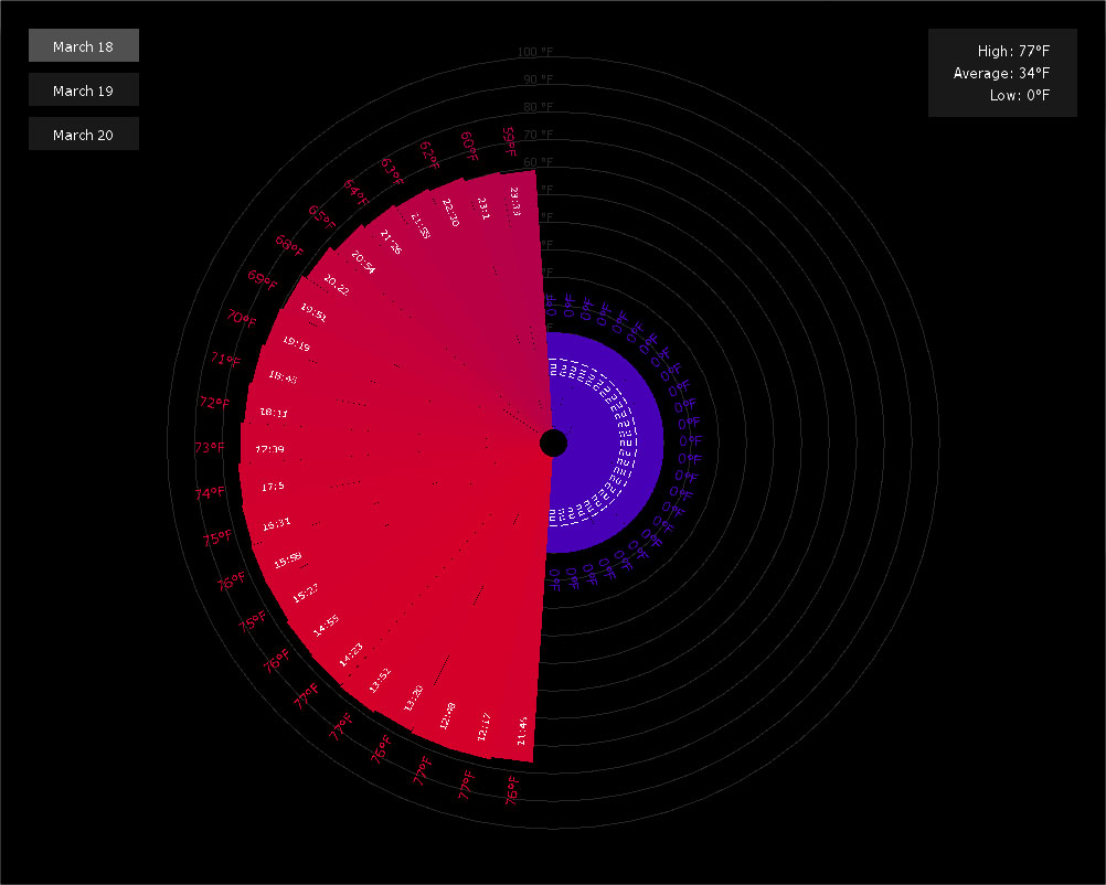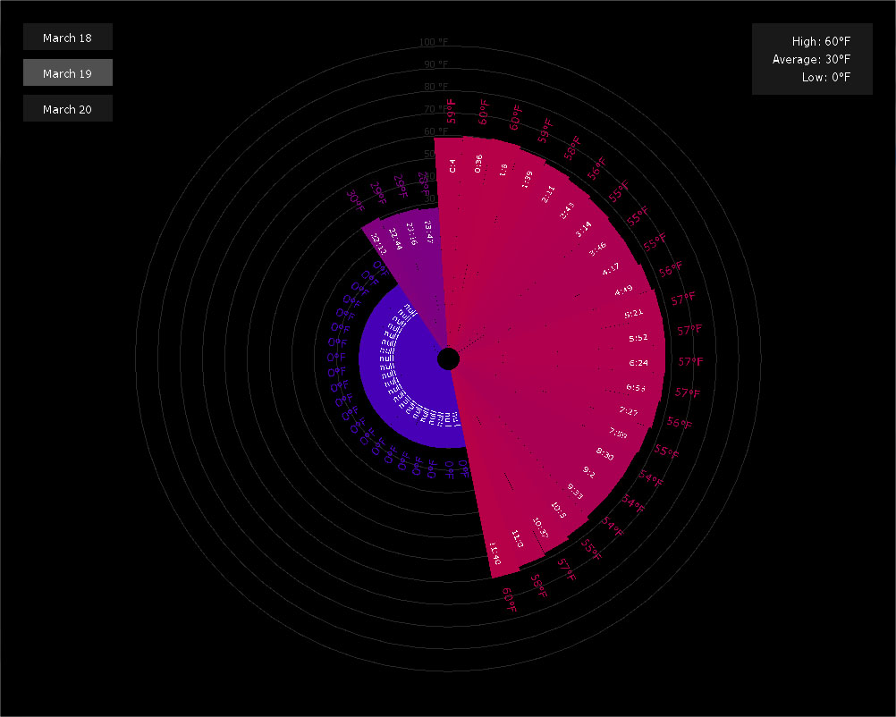 Second iteration. Now the data is logged and saved to text files for visualizing later and I’ve experimented with a circular graph. Temperature is sample and averaged over half hour periods, so each day has 48 samples. Unfortunately over the past week I haven’t been in one place for too terribly long, so I’ve only been able to successfully log one 24 hour period.