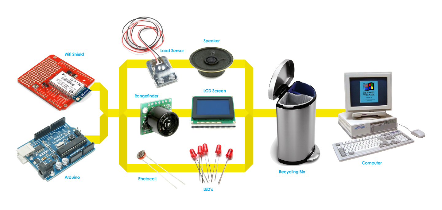 Arduino, wifi shield, ultrasonic rangefinder, speaker, LED’s, Photocell, load sensor, LCD screen