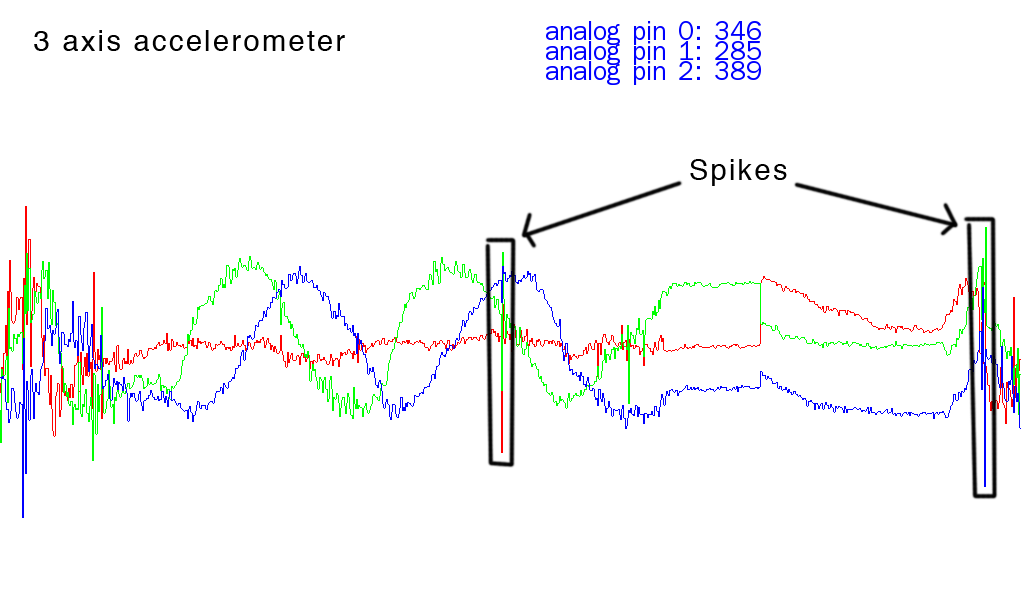 I’ll need to test more, but at this point, the gyroscope seems to do everything I need in terms of tracking velocity. In addition to not having spikes, the data will be much easier to interpret: just take the absolute value of the distance from the norm of whichever axis is giving stronger readings. In pseudo-code: