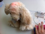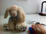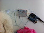 This is the first look&feel prototype with wires. The bunny has an LED on the head and a vibration motor inside. On the other side, I have my plushy socks with a force resistor inside. When I hug my socks, the bunny’s head light up and it vibrates.