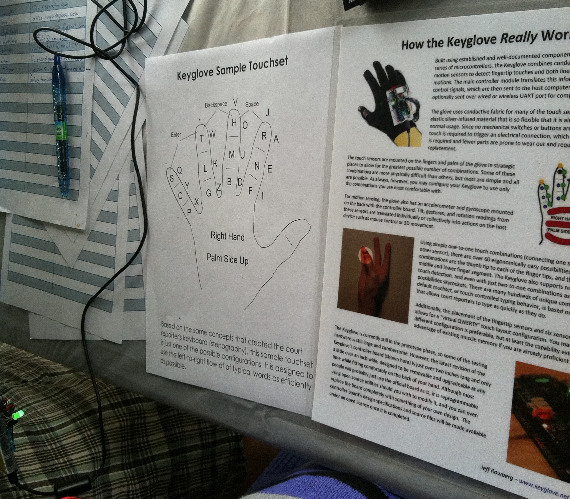 The product that got me most excited inside the Arduino tent was a product entitled “Keyglove“ by Jeff Rowberg. This is because during my industrial design studying days, I remembered a concept mobile phone that used fingers to represent keys. What intrigued me the most was the possibility of Keyglove’s further development. Although people are used to QWERTY-based keyboards, it doesn’t necessarily mean it HAS to be the most comfortable. Because the wearable computing market is becoming very popular I believe the Keyglove will impact the world of gaming, design, art, music, etc. I’d love to see a further developed Keyglove where if I made a certain shape with my hand while putting on Keyglove, a 3D CAD software would automatically create the shape I’m making with my hands.