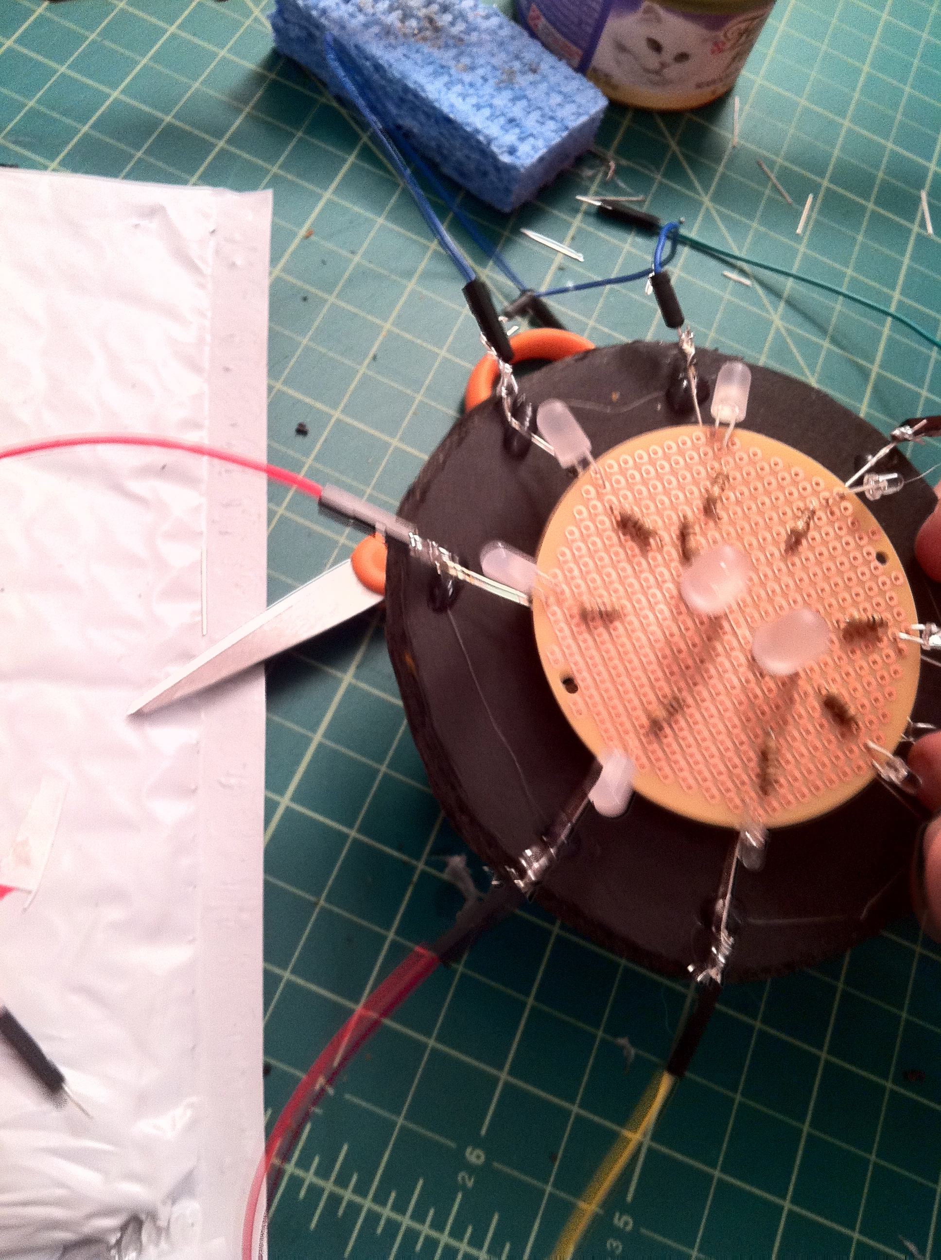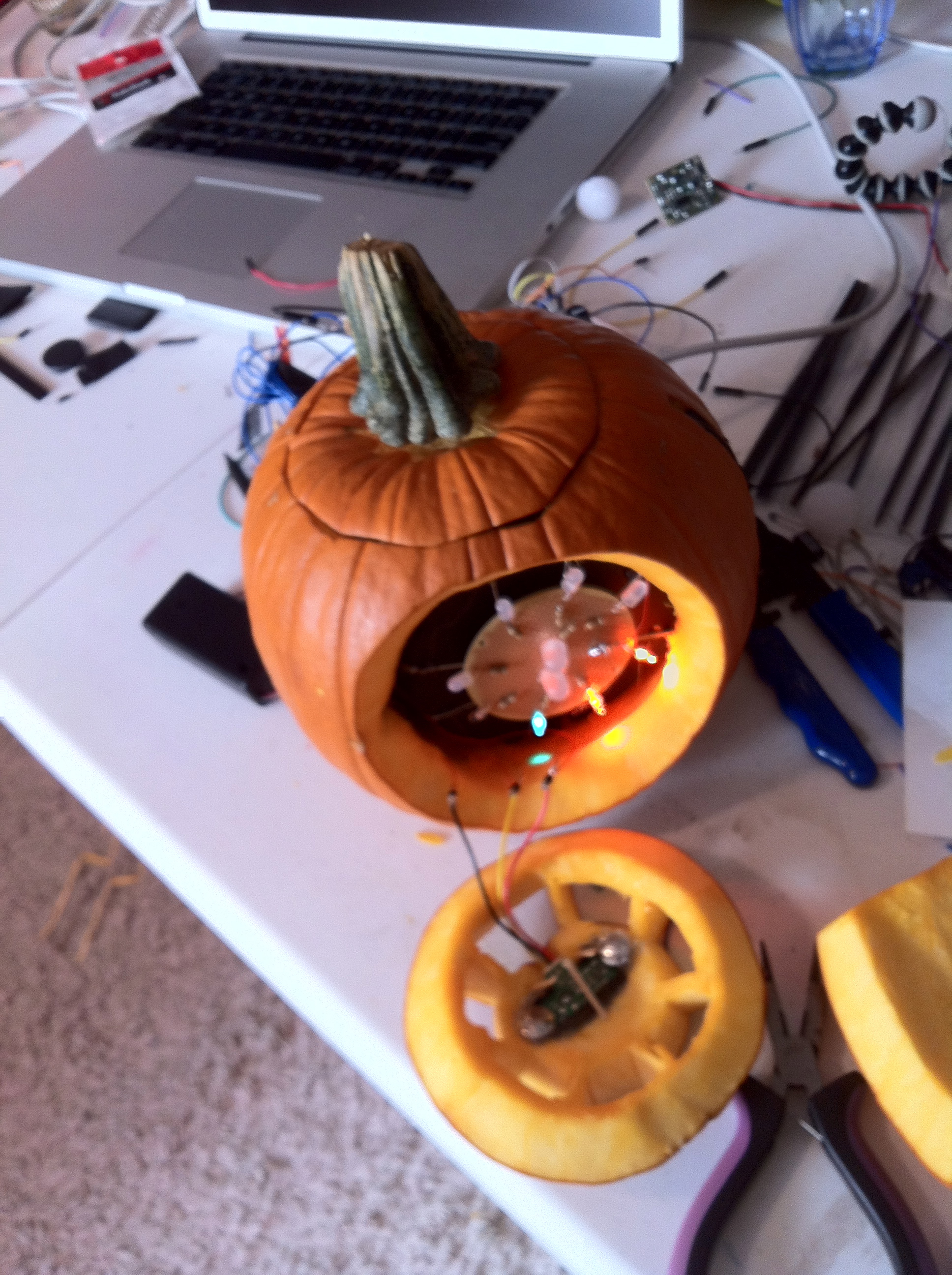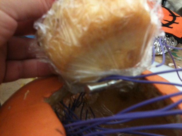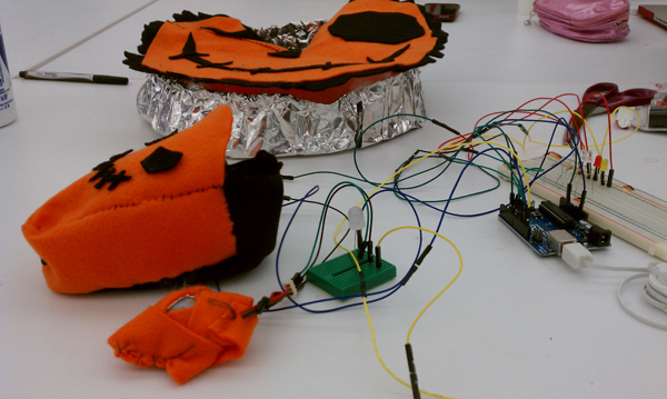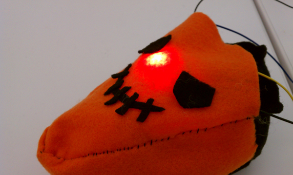The mac-o-lantern thinks it has a little Pentium heart <3. So to light up your pumpkin you need to treat it just like a computer. When you’re not using it, it’s in sleep mode, fading in and out (breathing). To wake it up you need to push its right patch, and a white light will turn on (simulating when it’s on). Then it has a little mouse. When you move it over the switch, it will connect to the internet (dial-up connection tones). Then, you need to click the button on its left patch, and it will download the Halloween software. A beeping sound indicates when the download is done. When it finishes downloading… you can now turn off the lights and the pumpkin will light on, and it will be ready to light up the night!