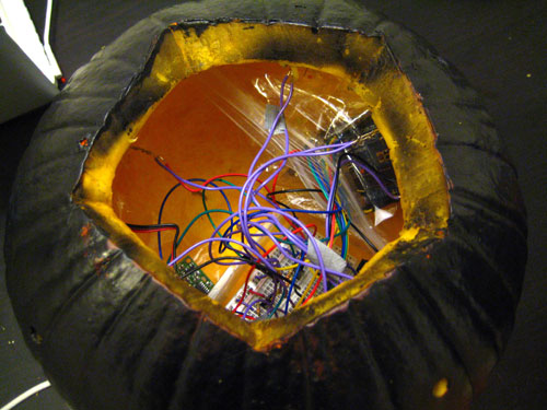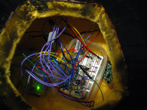 The lamp consists on a black-pumpkin, as night, which has blue LEDs and one RGB Led.