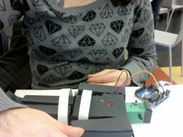 For the pulse sensor I decided to make a toy for children to take their pulse with in a fun way. I constructed a toy Frankenstein out of construction paper with an led heart. As a person touches the pulse sensor they bring life to Frankenstein, creating a monster!