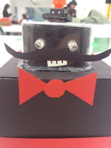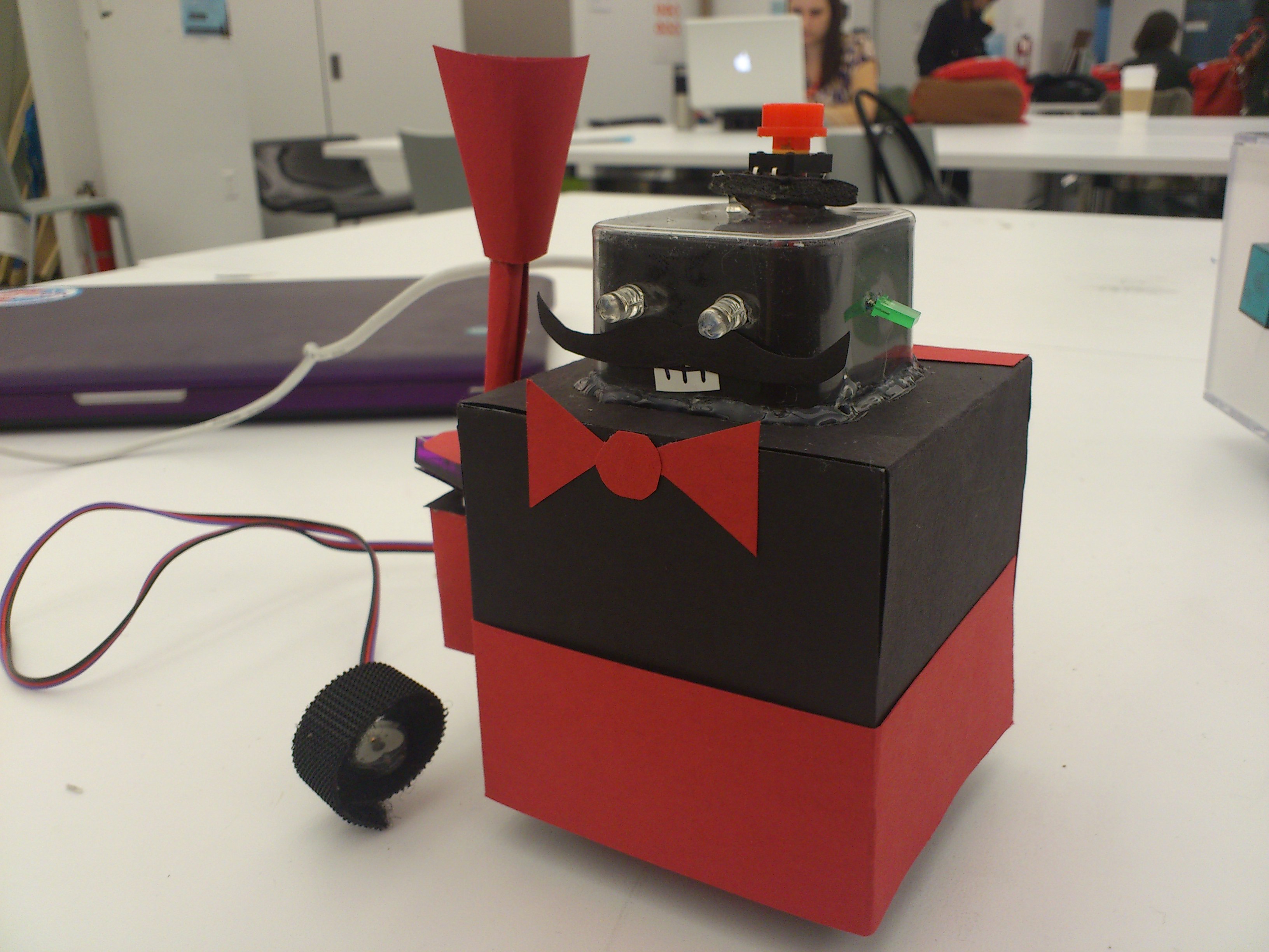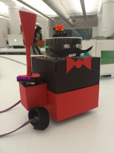 For this second iteration, I wanted the moving of the servo motor to have more meaning. So I made him move his arm, with a glass of martini (or a broom?) in his hands, representing that he is ready to serve you. He’s a little butler like his wife :).