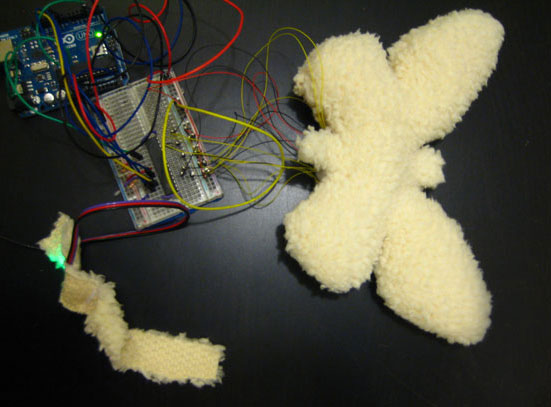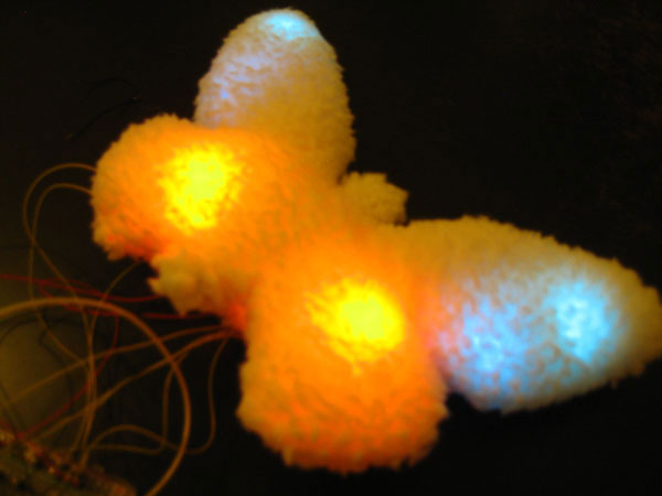 It has color LED’s on its wings. During the day it’s a toy but at night it can be attached to the baby crib, becoming a night lamp.For now is blinking in response to a pulse sensor. The next step is to make it wireless and replace the pulse sensor for an on/off button.