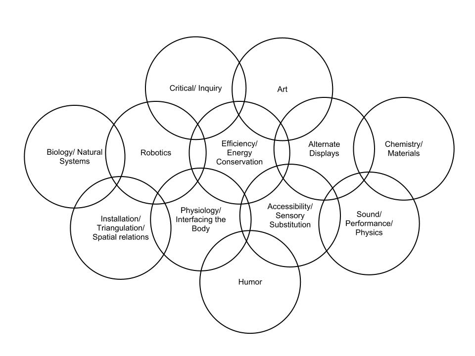 The easiest part of this exercise was thinking of all my interests and the most difficult part was organizing and editing them. The Venn diagram is deceptive in that it forces you to consolidate your thoughts. My two favorite concepts are the gaming/wagering project and the classroom noise monitor. My two least favorites (currently) are the pollution monitor and the extra steps installation.