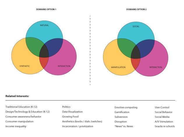 The easiest part of this exercise was curating the ideas. Almost all of the ideas were in some form in a sketchbook or my Evernote account, but it was a little challenging trying to boil down the abstract concepts to a slide’s worth of information. The hardest part was grouping the domain maps. Looking at them now, I’d like to go back and try to collect them into one diagram and see the differences and connections between each of those domains. Right now I don’t think they’re as insightful as they might be if I were to condense them.