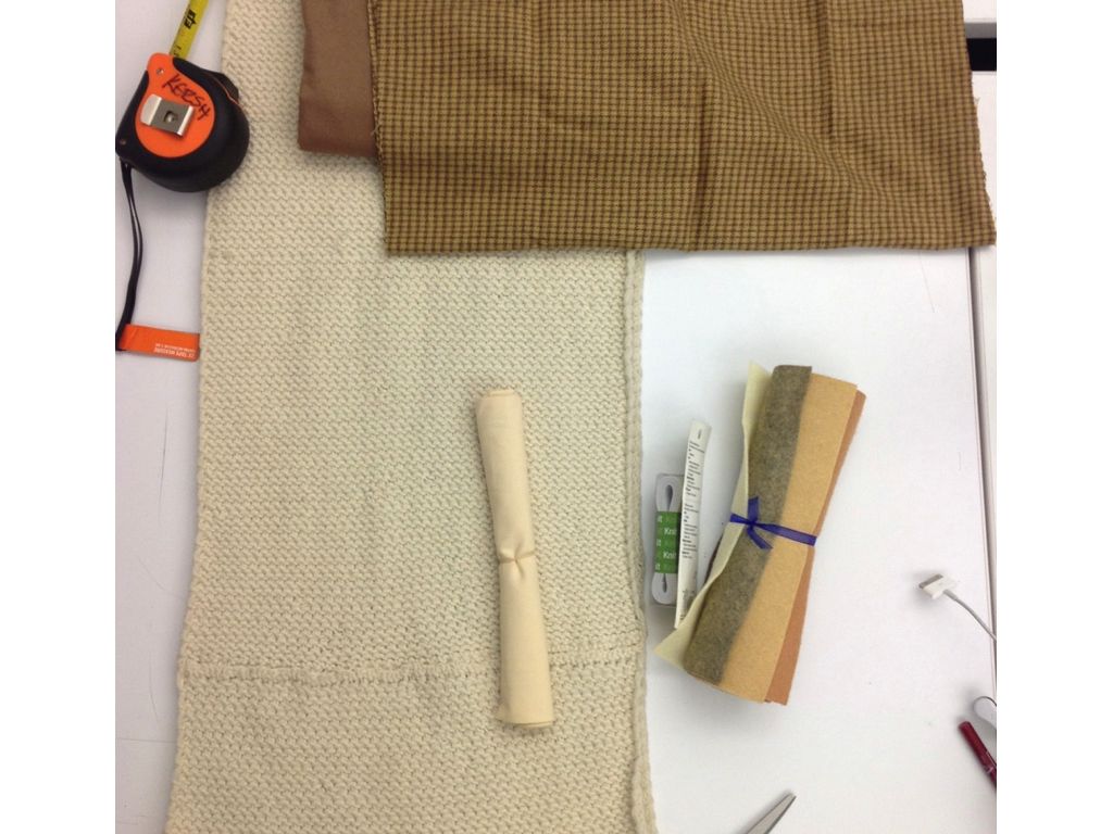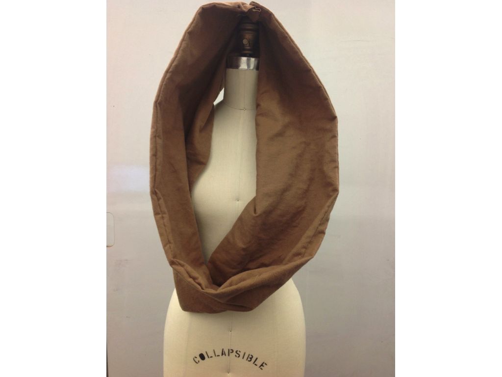 After user testing and receiving feedback that the headwear was too heavy and distracting I decided to move forward with a different design. The design idea came from a friends unity scarf. This scarf when worn on the head was soft warm and comforting. I used this design and added pockets so that the machine pieces could rest on the shoulder of the participant. These pockets were created to be movable so that based on the participants height they could still rest on the shoulder. The unity scarf had a headband in which the EEG reader pushed against the forehead. The EEG was concealed and the headband was made of elastic and velcro so that it could fit correctly.