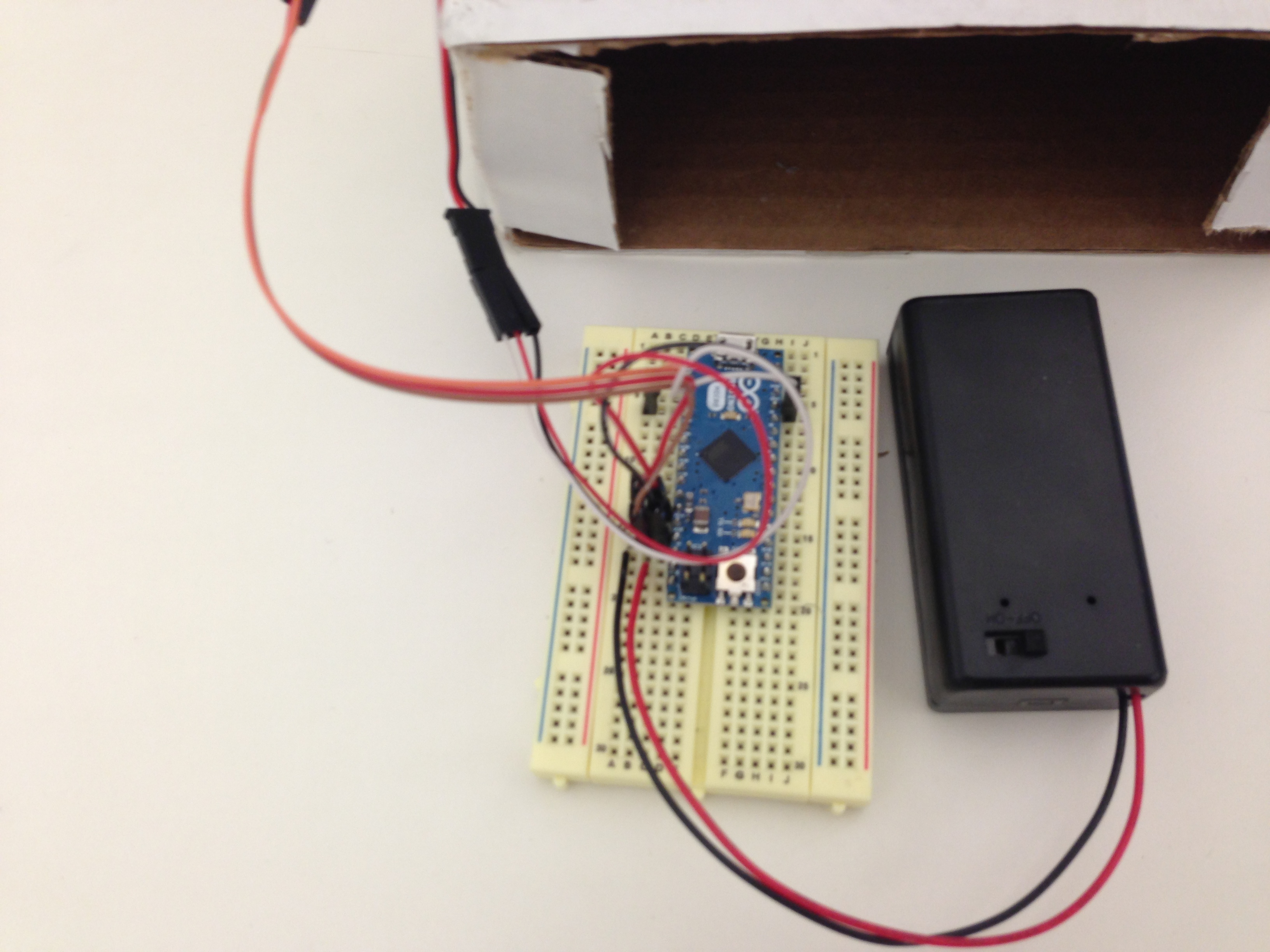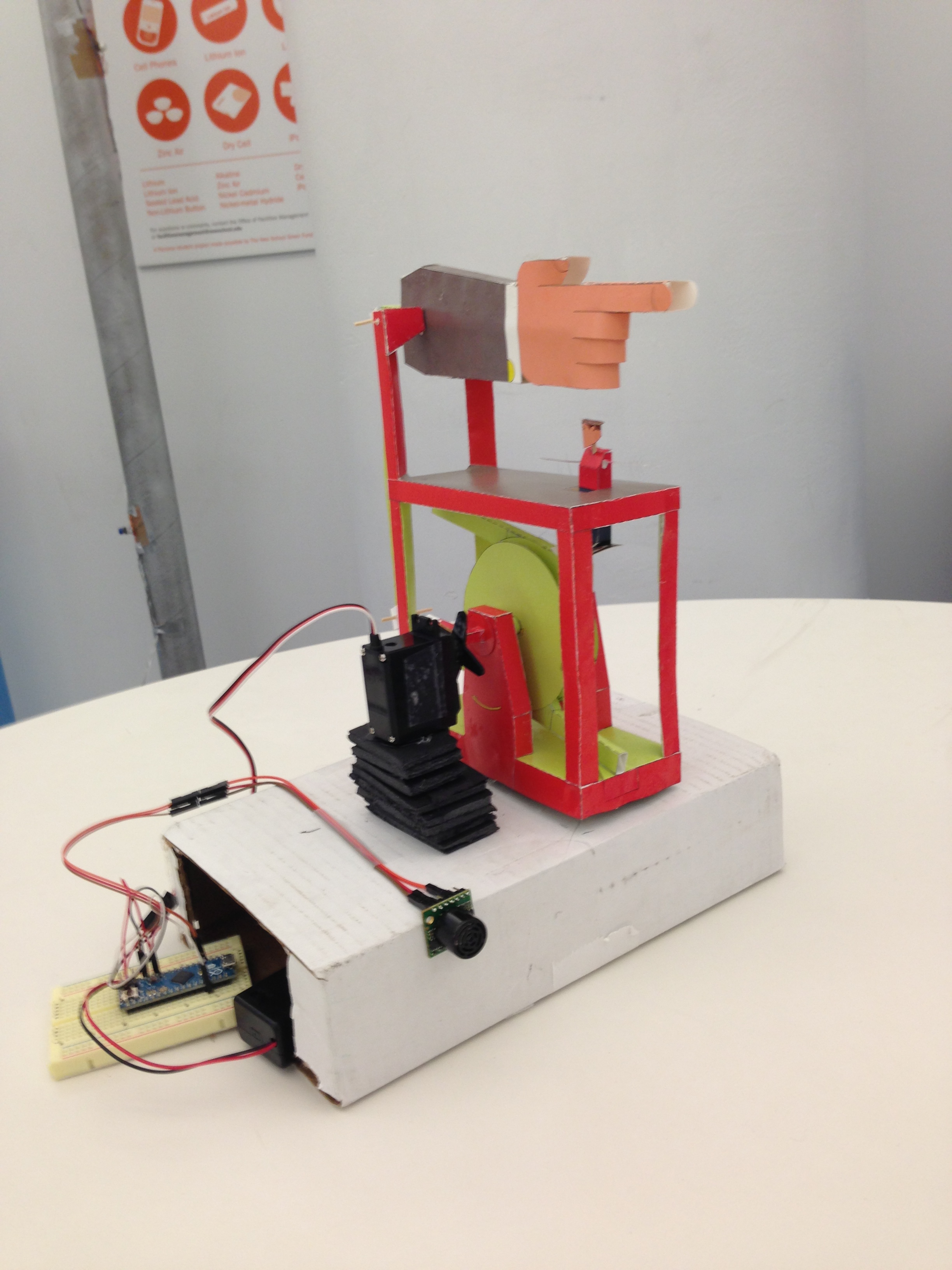 My third paper automata assignment was “Weight of Bureaucracy” from book, Models that Move. I was super fun automata, but it took more than 6 hours to actual making the paper automata. The challenge part was the servo has to turn only one way, otherwise the paper automata is broke. So, I had to carefully observe ultrasonic rangefinder values and calculate servo position for the value in code. Using an Arduino Mini and an battery power were simple and easy.