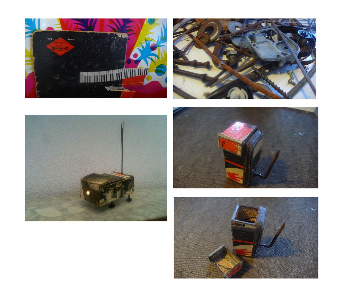 They are constructed of metal scrap found on the city streets, old record covers, and electronic components.