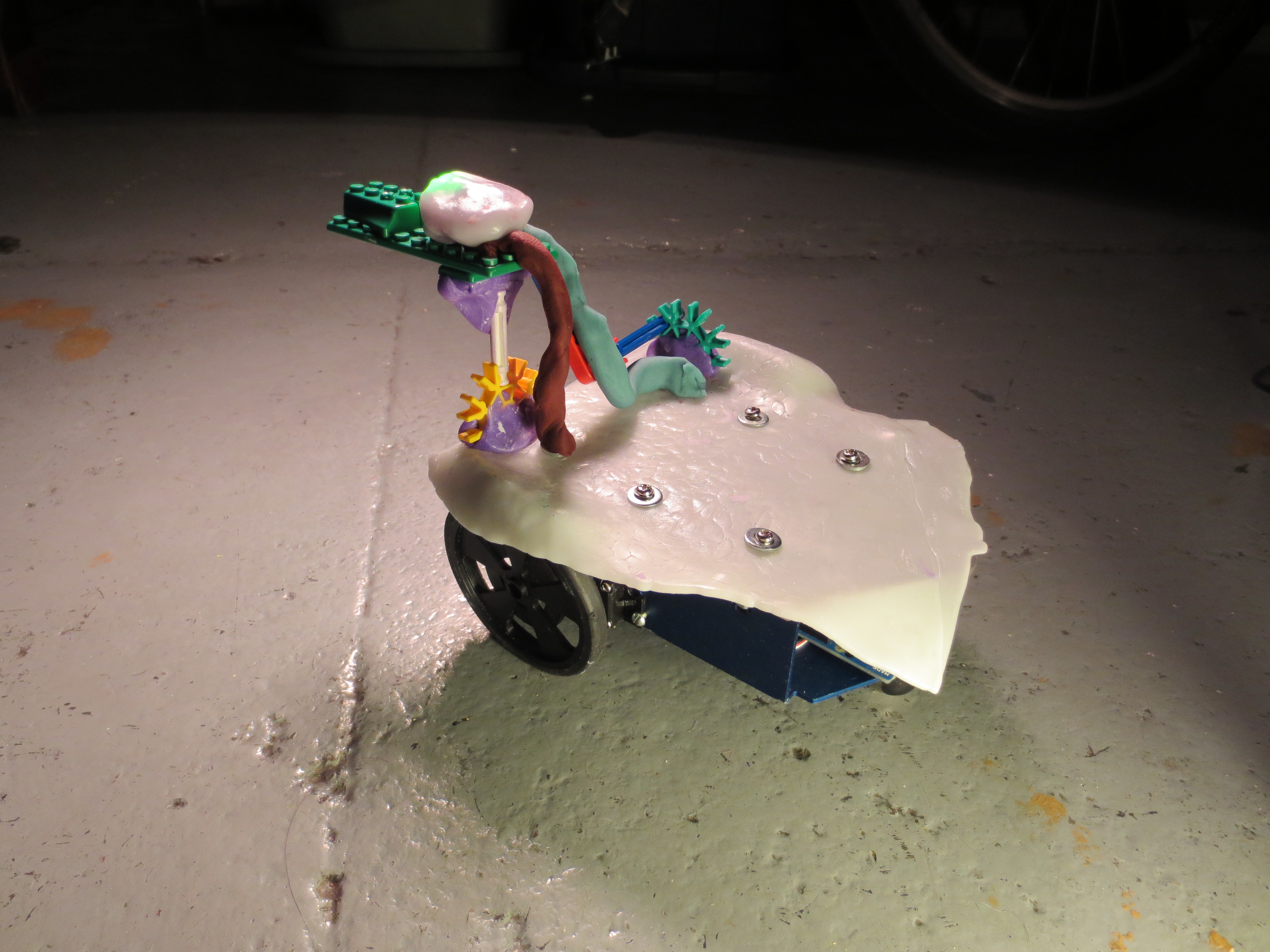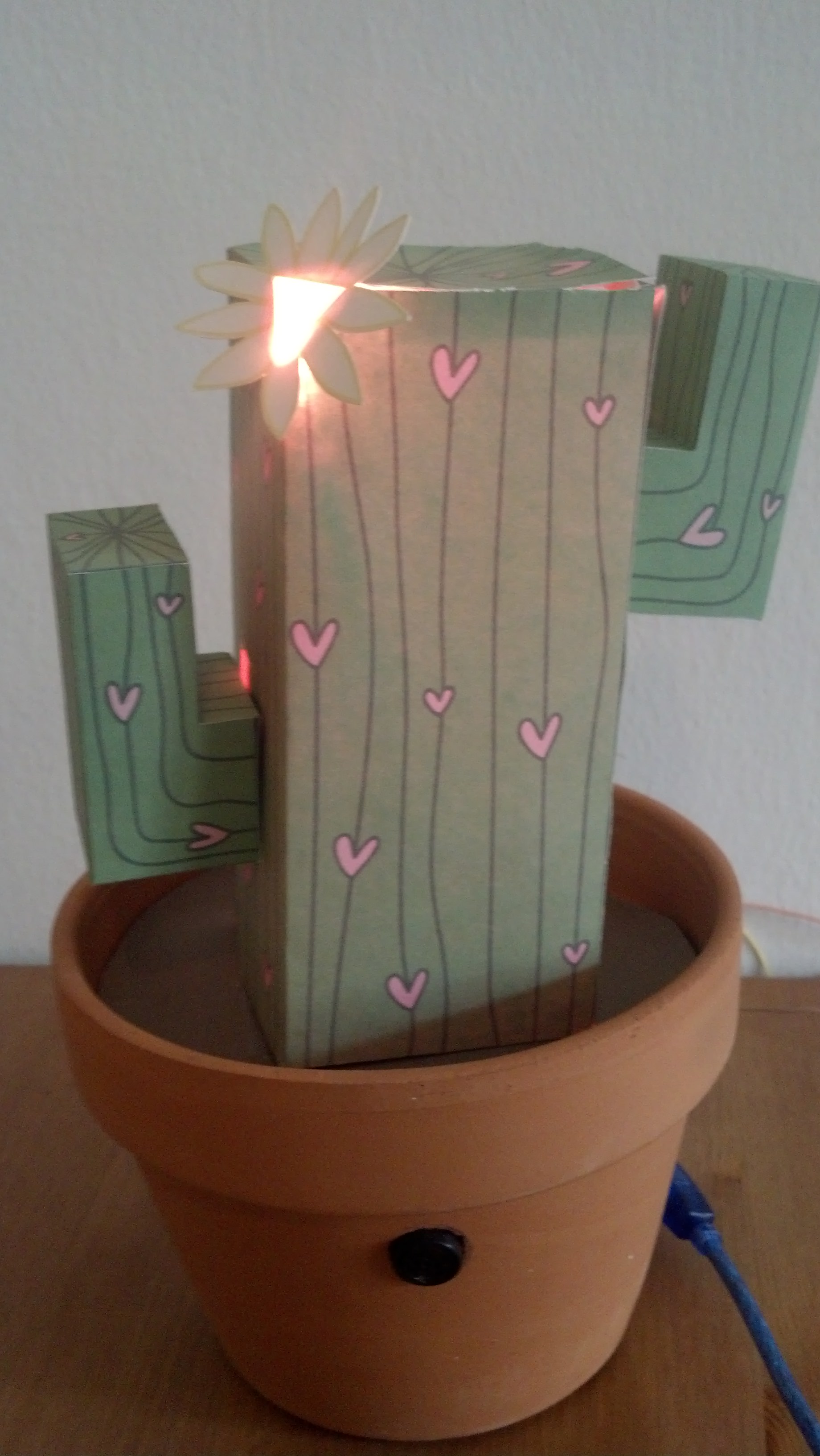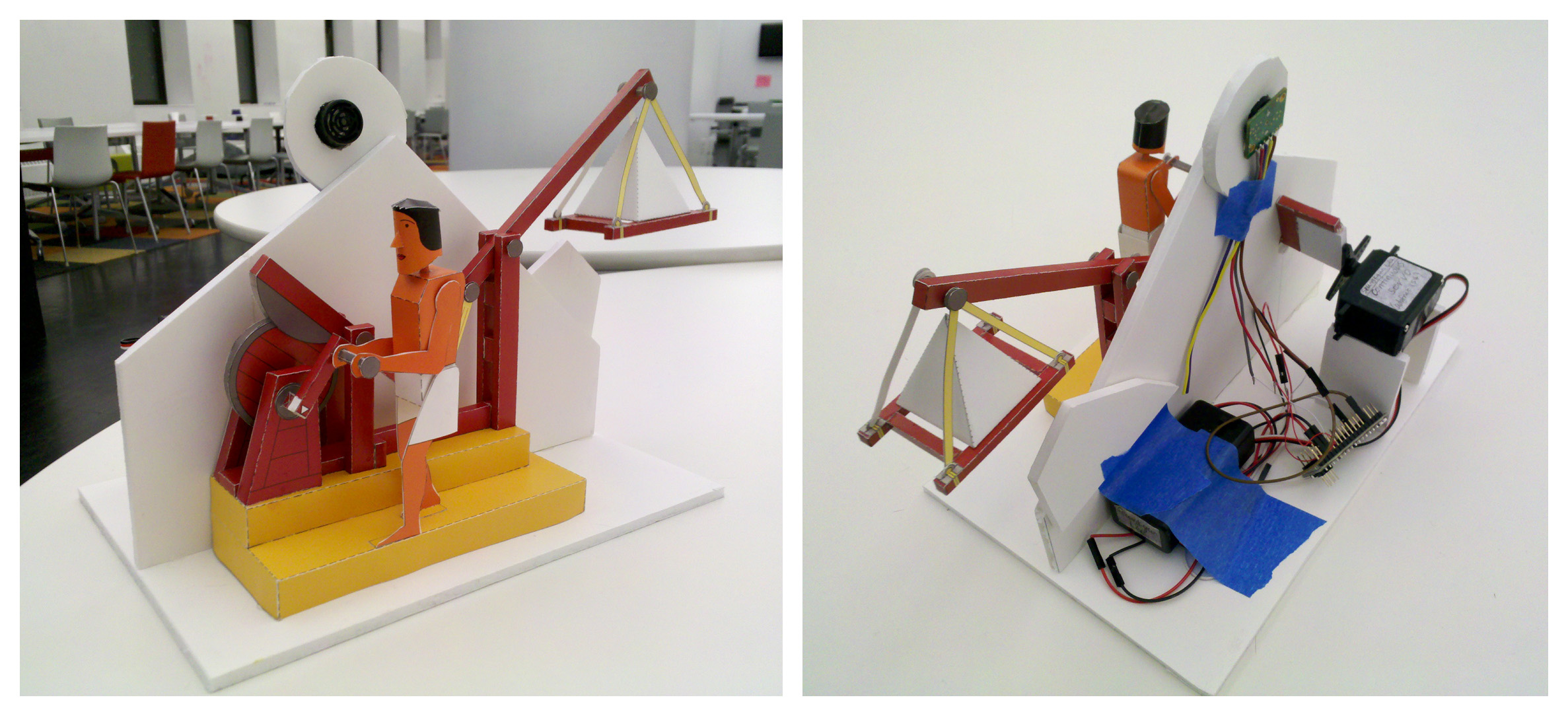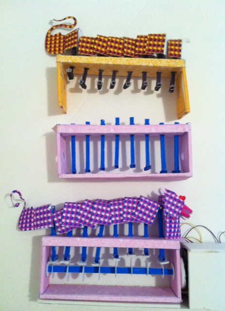 For both objects we used materials such as: cardboard, felt, paper, tape, glue gun, pins, led’s, servo motors, foam board, elastic bands, acetate paper and arduino.