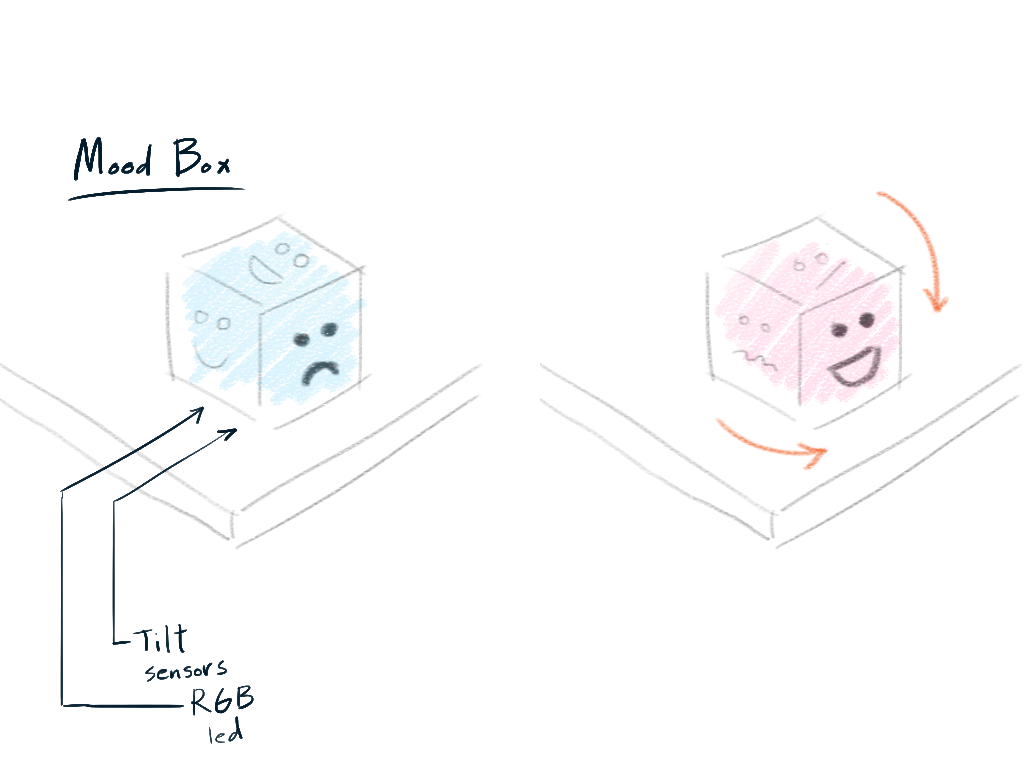 3 tilt sensors detect the changes in the x, y and z axys. By doing so, it is possible to track which is the “current” face. That triggers a different color animation of an RGB LED inside of the box.