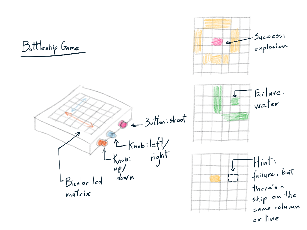 Two potentiometers control the x and y position of the target. A push button shoots. 3 different feedbacks: red explosion (success); green waves (water); yellow line (missed, but there’s a target either on the same line or the same column).