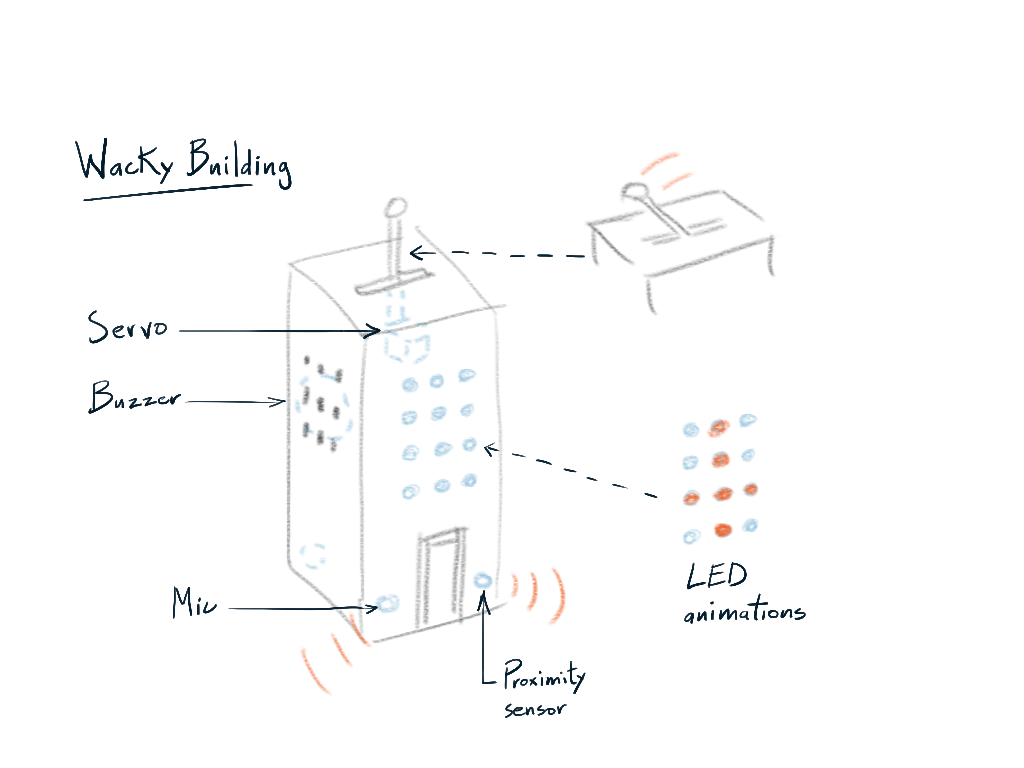 3 sensors may trigger the interaction: sound, lightness and tilt. By turning the ambient lights off, the window-LEDs will start to turn on. Shaking the building triggers an alert sound and animation. Loud sounds trigger a song (played using the buzzer) and an antenna animation (servo).