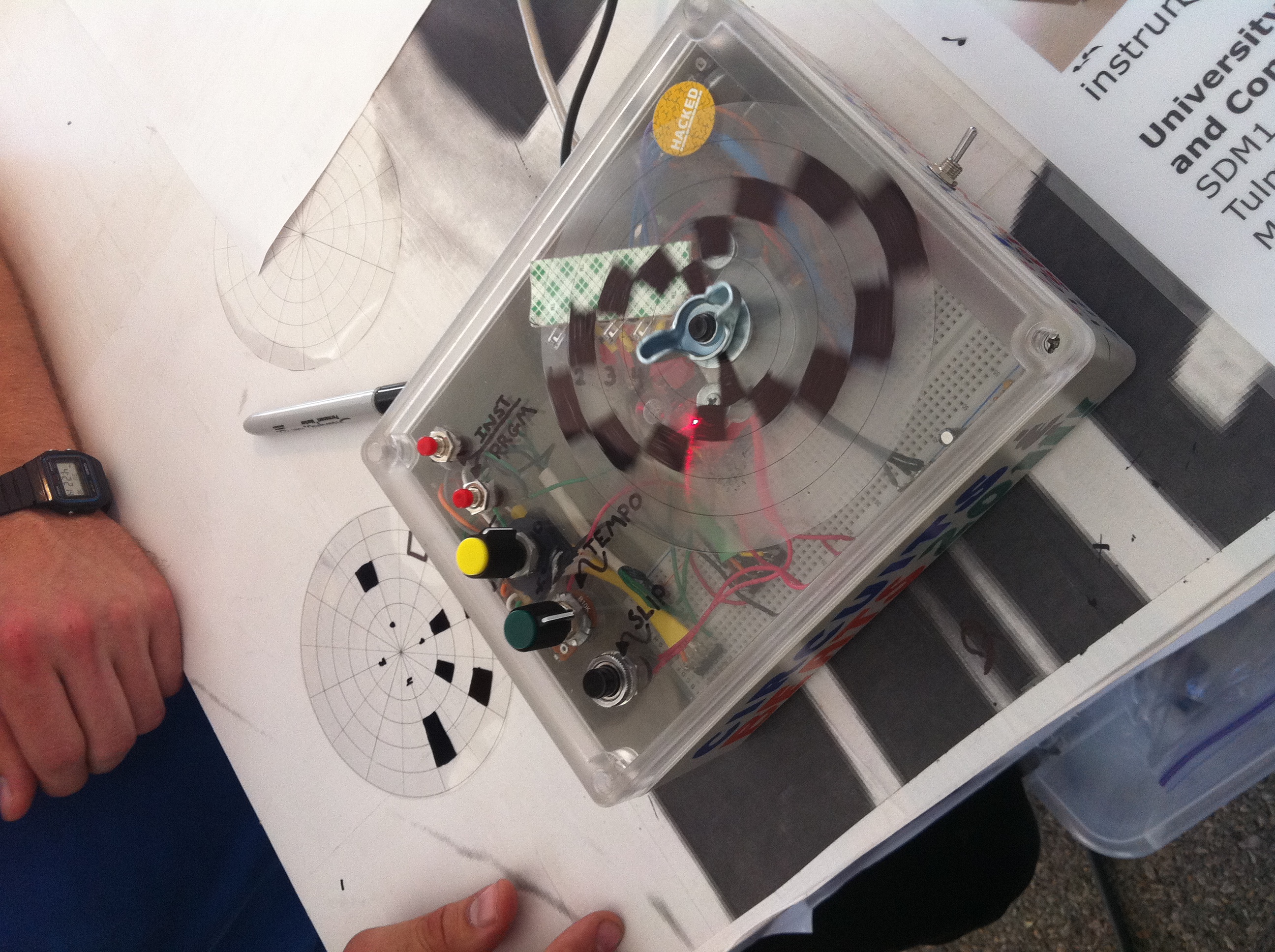 [update] after poking around during class, I discovered a questionable soldering connection for the sensor. Excited, since for some reason the red lights only work if the sensor works, I figured if the connection was made everything would be back up and running… and sure enough after clipping the ground cable to the sensor and resetting its contact with the ground wafer, everything came back online. Still had obvious issues with the spinning disk and sure enough after a few demonstrations, two more wires were torn from their solder (once again killing the sensor and an additional LED). It was a great first run though and a great learning experience in terms of building within a decaying fruit.