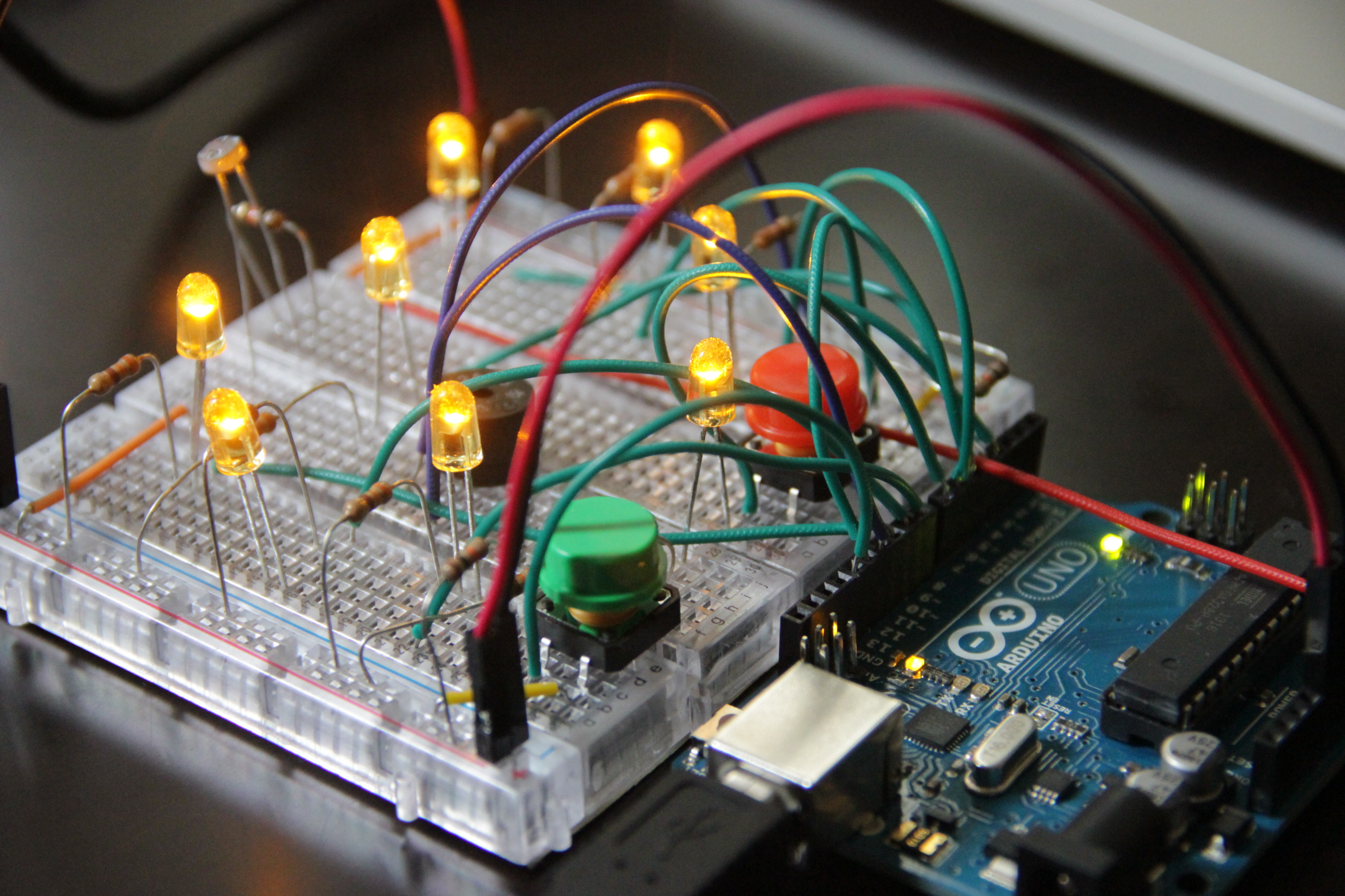 a. Replace buttons for photo resistors to enhance user experienceb. Two players compete each other by taking turns to say and play using one Arduino