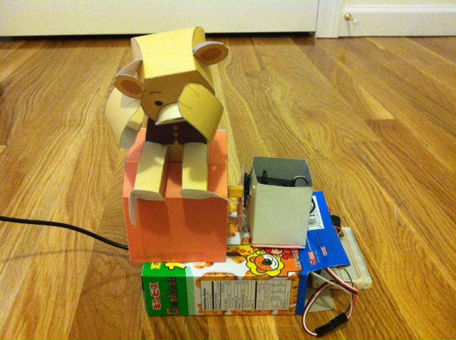 During the Chinese New Year, it is customary for Chinese Association to perform Lion Dance to communities in a “cai ching” (採青) ritual, where it literally means “plucking the greens”, to red envelopes. It is believed that this quest would bring good luck and fortune to businesses. For my automata, when the Lion gets in contact with an item (e.g. green cabbage, red envelopes), its eyes would grow red and move faster.