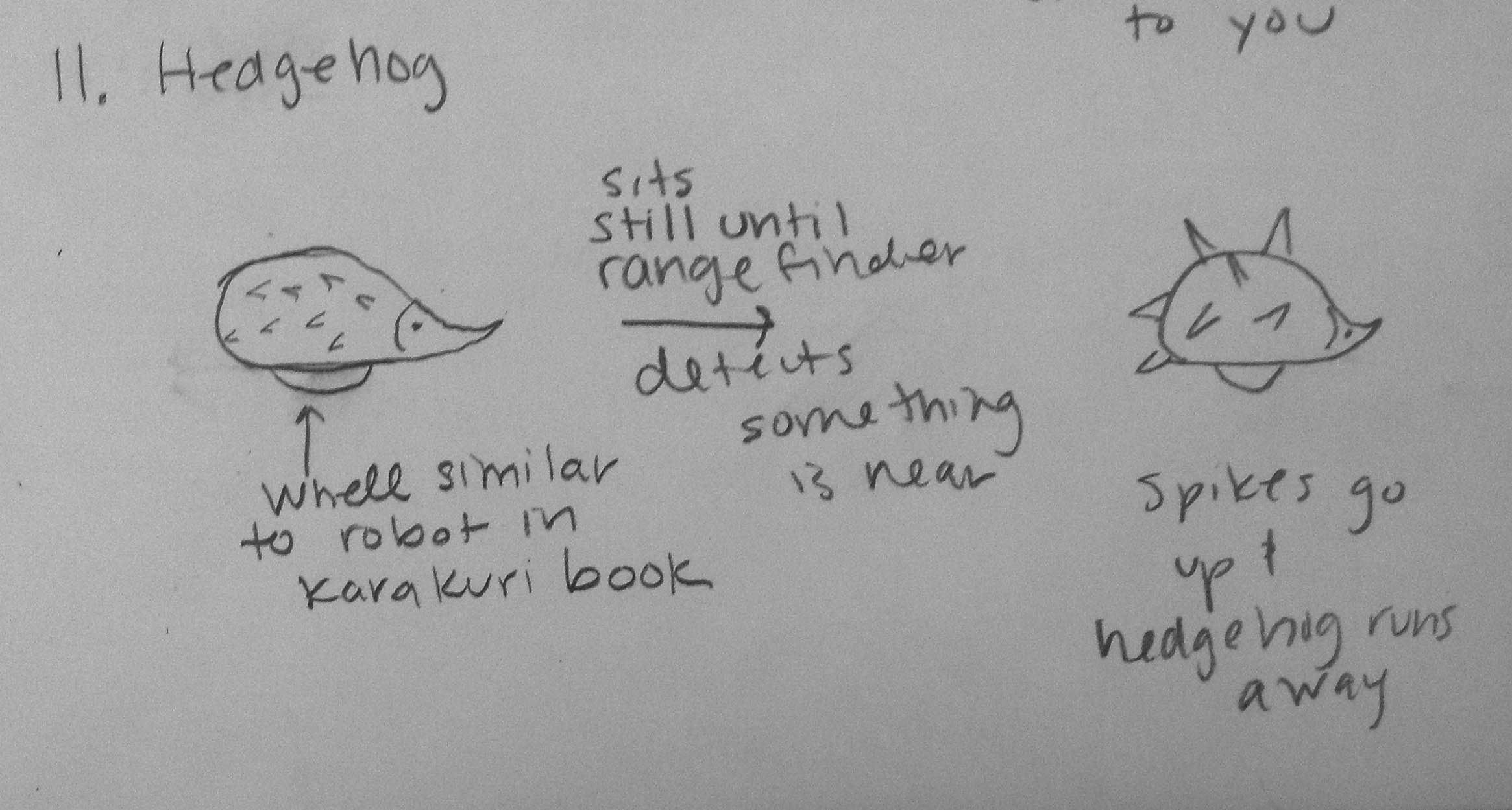 This is inspired from my hedgehog Dexter who is scared of everything. It would be built like the robot and whenever it sensed anyone around it would put up spikes and try to run away.
