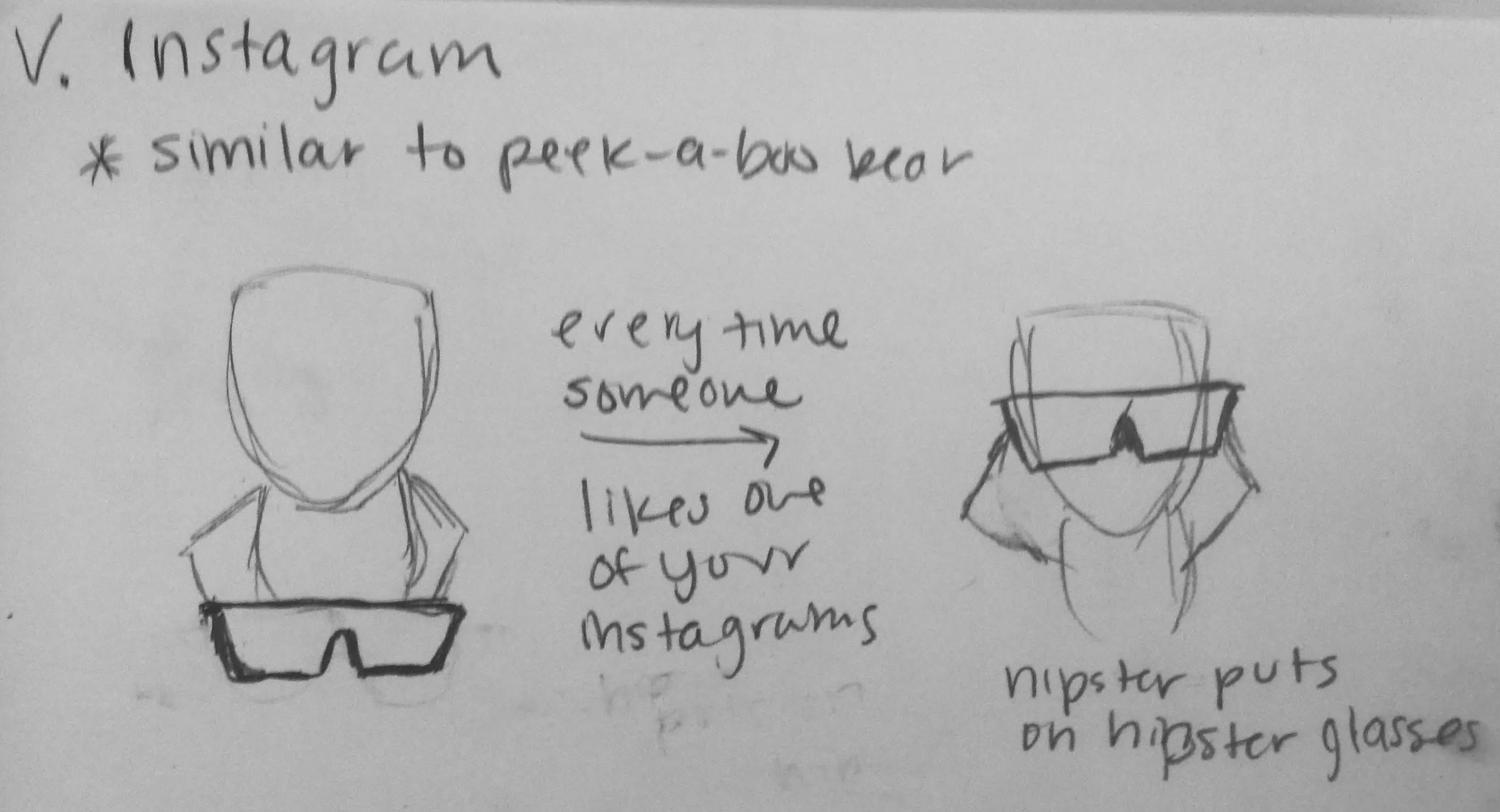 This would be similar to the twitter one and whenever someone likes one of your Instagrams a little desk hipster puts on glasses. It would work similar to the peek-a-boo bear.