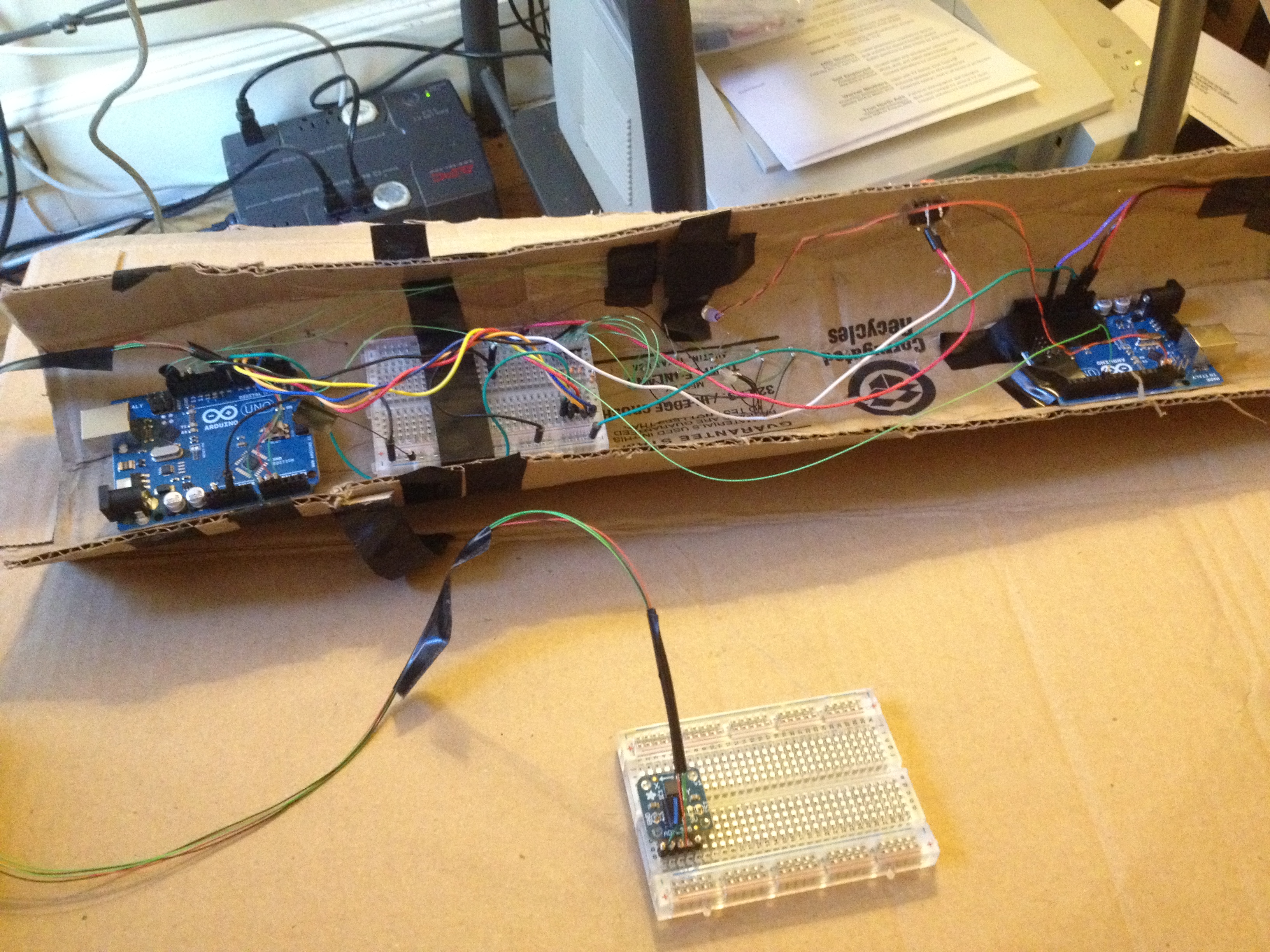 Big finding 2: Getting the servo motors to work synchronously was much more difficult than I had assumed it would be. Through a series of several rebuilds of the car I’ve tried to realign the wheels and secure them with hot glue, but I still have had trouble getting them to match each others momentum. As far as I can tell it must be a mechanical issue, because I feed both motors the exact same code and yet one wheel always seems to be dominate and cause a turn when I try to do a straight line. Lately I’ve been trying to correct this via the code, and I think I’ve finally found a sweet spot that gives me a moderately straight line over the span of a few feet.———