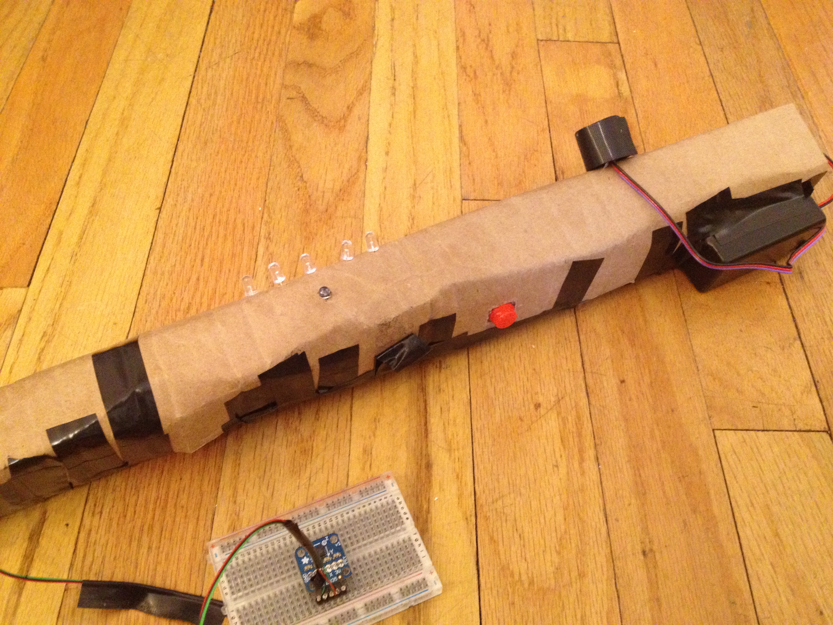 A simulated intruder enters a house with a “victim” in an attic (not seen from the viewer’s perspective). As the intruder enters the first room, LED’s are timed simultaneously to the user’s heart rate – directly correlating the user’s heart rate. The only way to keep the intruder from ascending to the attic is “not to panic.” If the user “panics” with an increased heart rate, the intruder proceeds to the next room, then to the next level, and so forth to the attic. Once the attic is reached the sound of the intruder’s footsteps are heard – simulating by a “walking” servo motor with a rotary blade.